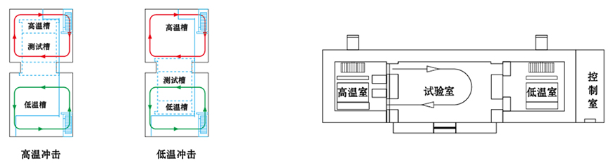 | 兩廂設備區分為高溫區和低溫區兩部分,測試產品置于提籃中,沖擊時提籃將測試產品 | ||